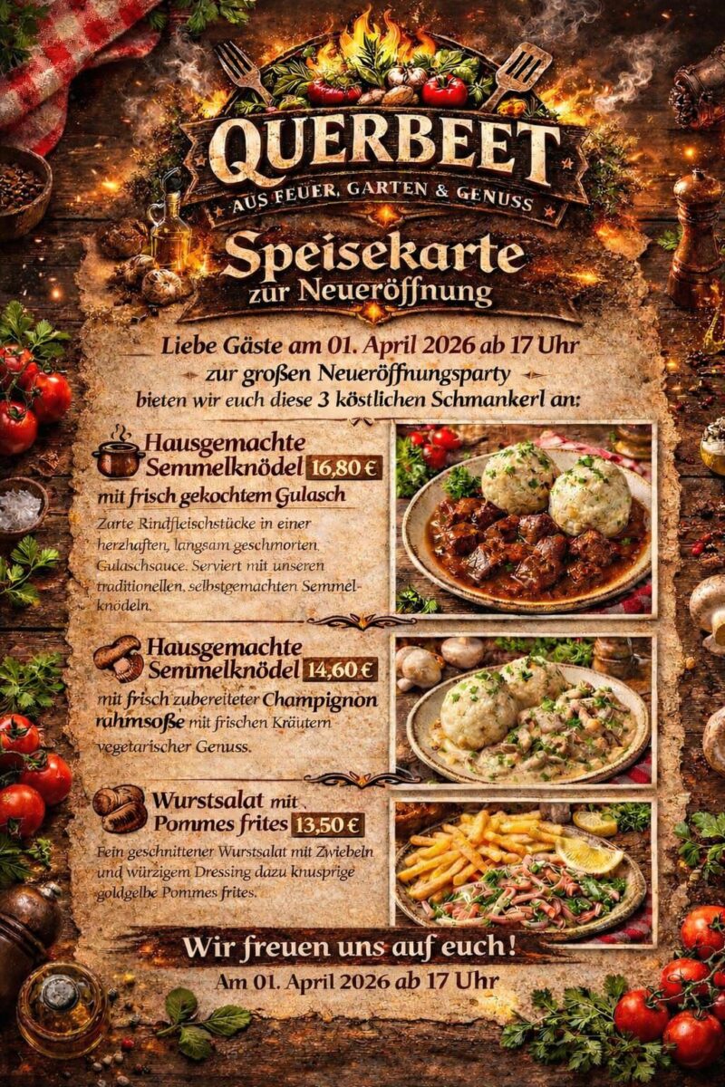 Am 1. April 2026 feiern wir ab 17 Uhr die Wiedereröffnung unseres Vereinslokals „Querbeet“ im Kleingärtnerverein.In den vergangenen vier Monaten wurde mit viel Einsatz und Herzblut gearbeitet, damit unsere Gaststätte in neuem Glanz erstrahlen kann. Vor allem die Küche war zuvor praktisch nur noch ein Rohbau und wurde nun komplett neu ausgestattet. Auch der Gastraum wurde umfassend renoviert und lädt unsere Besucherinnen und Besucher jetzt wieder in gemütlicher Atmosphäre zum Verweilen ein.